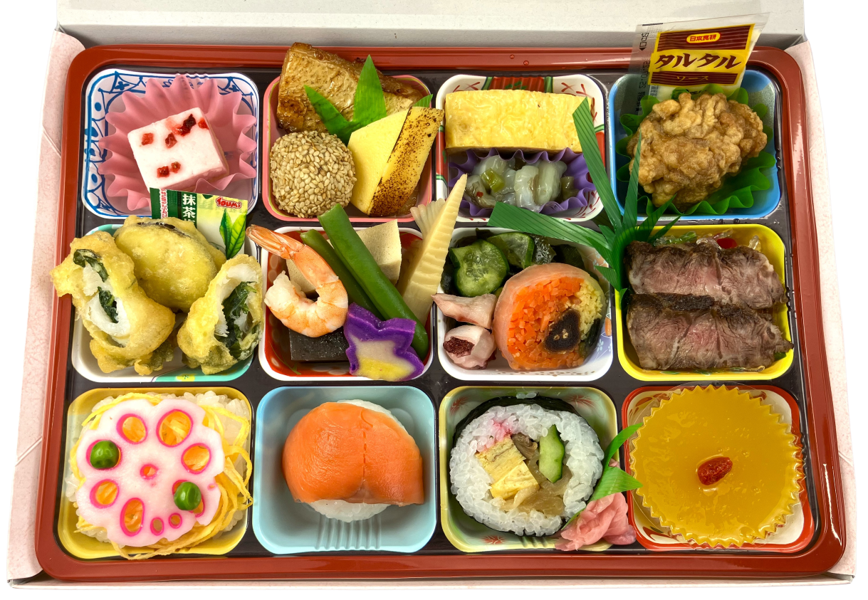 12仕切りで色とりどりの華やかなてまりずしや宮崎県産の和牛ステーキ、マンゴーなどが入った豪華お弁当です。